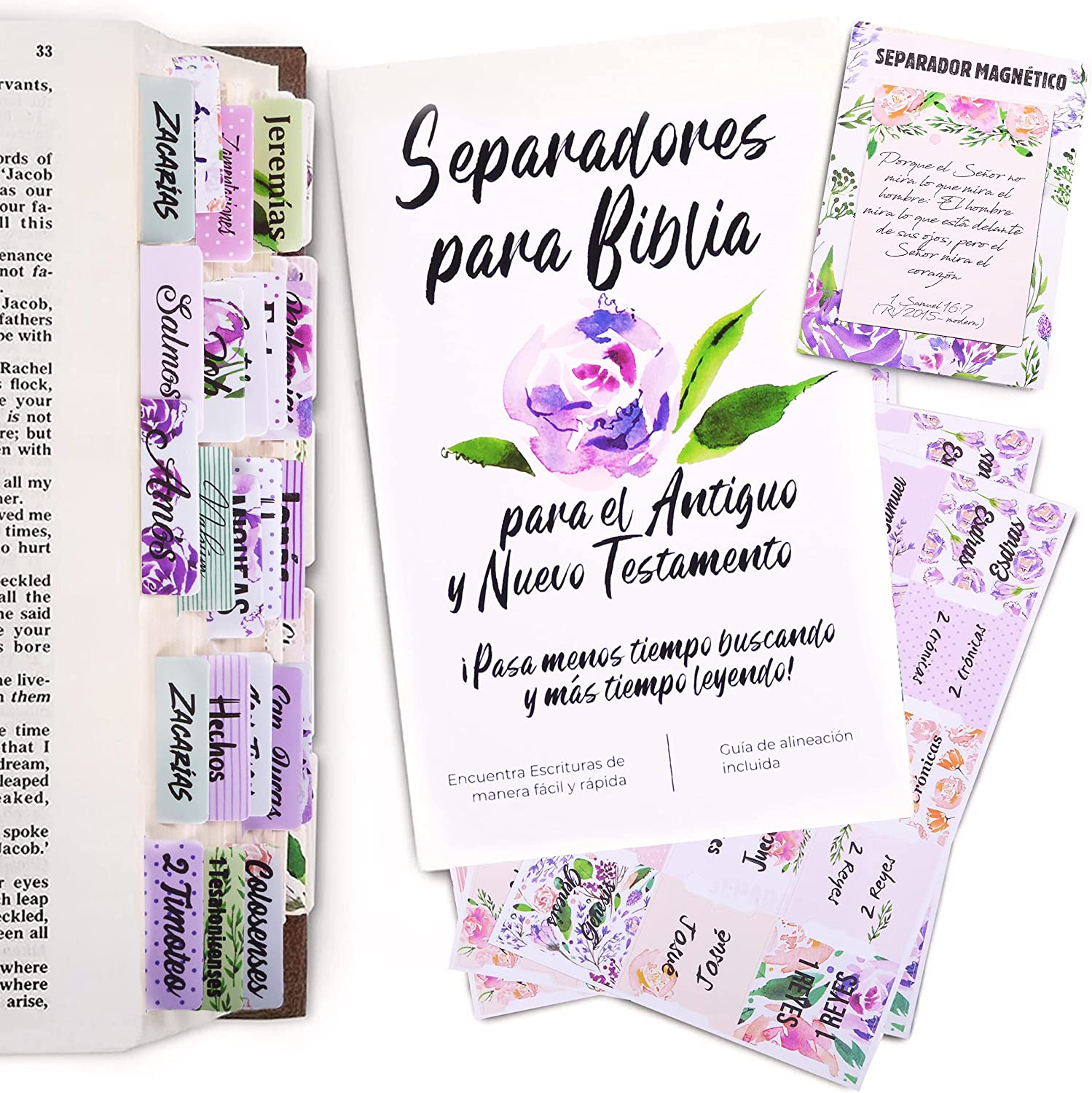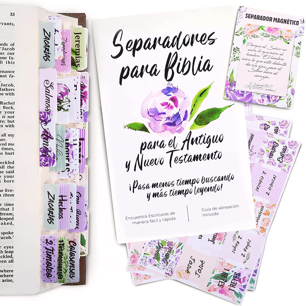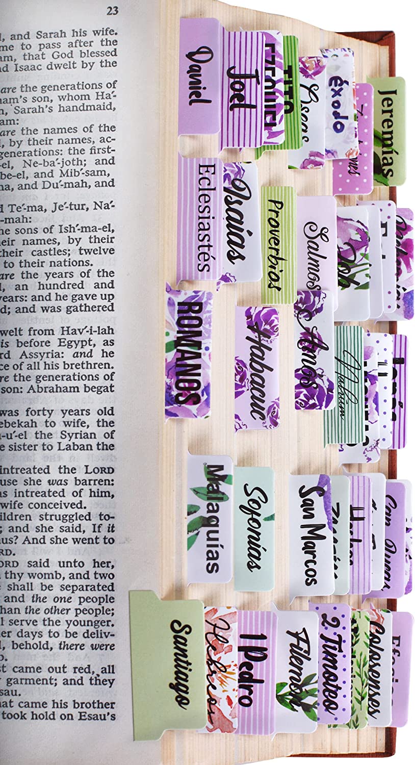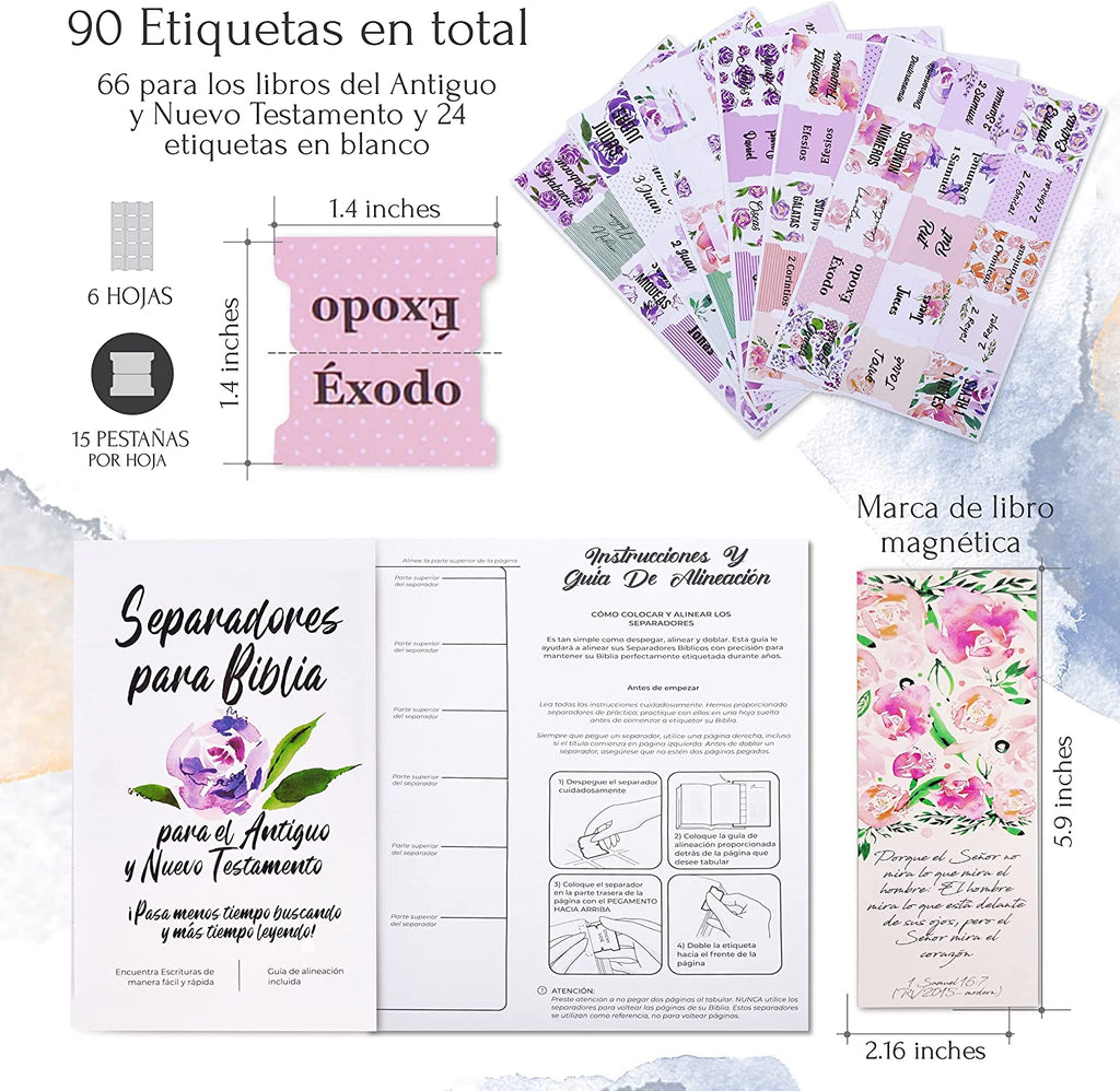 ¡Estas pestañas de capítulos de la Biblia son el toque perfecto! Nuestras pestañas de libros de la Biblia vienen ya preparadas y súper fáciles de poner, todo lo que tienes que hacer es despegarlas y aplicarlas en tu biblia, siguiendo las instrucciones. Cada juego de Biblia en español incluye 90 LENGÜETAS EN TOTAL, 66 Biblias en español con letra grande para todos los libros del Antiguo y Nuevo Testamento, y 24 pestañas en blanco, que se pueden usar en la Biblia católica tambien.
